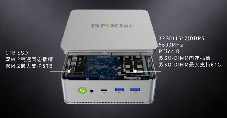 内搭载英特尔酷睿 Ultra 5 125H 标压处理器(14核/18线程、Intel 4 工艺、默频3.6GHz/睿频4.5GHz),提供双 DDR5 5600MHz 内存和双 PCIe 4.0 M.2 2280 SSD 扩展,最高支持64GB 内存和8TB SSD储存。