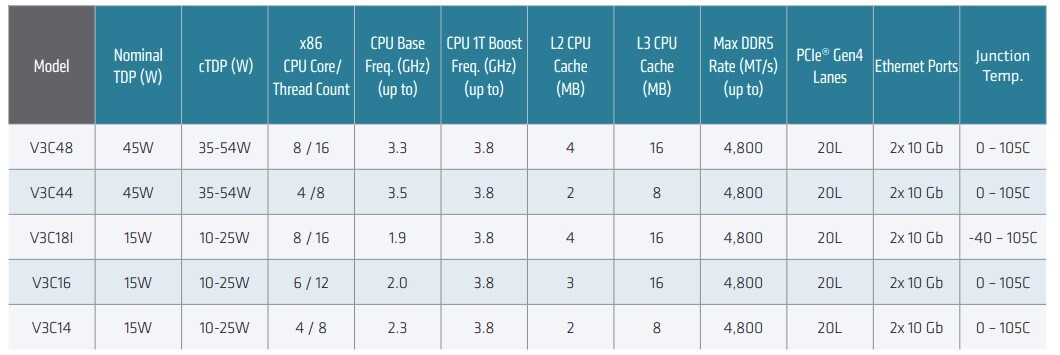 回到产品本身,AMD Ryzen Embedded V3000 系列提供四核、六核和八核配置,TDP从 10W 到 54W 不等,都采用BGA直接焊接在准备上,因此无法升级。具体规格如下: