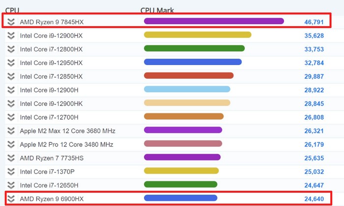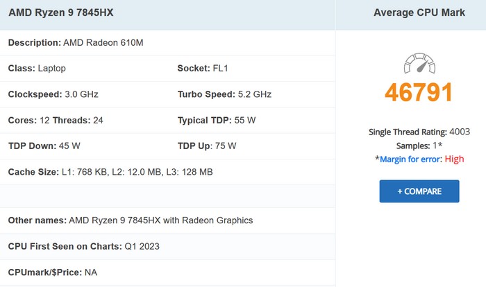 知名 CPU/GPU 天梯榜权威网站 PassMark ,已经悄悄更新上线了 AMD Ryzen 9 7845HX 的成绩,如图,多核心跑分高达46791分!