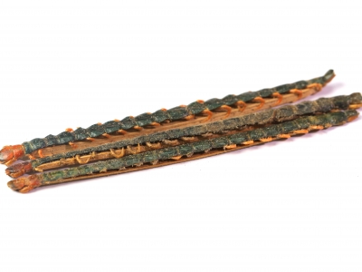 呈扁平长条形;质脆,断面有裂隙;有特殊刺鼻臭气。