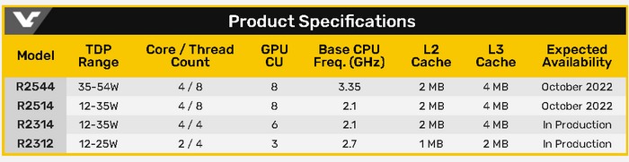 Ryzen Embedded R2000系列有四款,包括R2544、R2514、R2314和R2312四款,具体的规格就不展开聊了,如下: