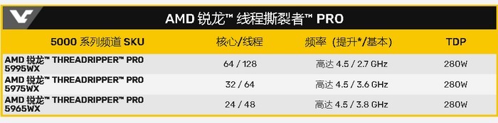 AMD Threadripper PRO 5000 WX 可选AMD Ryzen Threadripper 5995WX、5975WX和5965WX三款,最高64核心、288MB缓存,280W 功耗,支持2TB内存,具体规格如下: