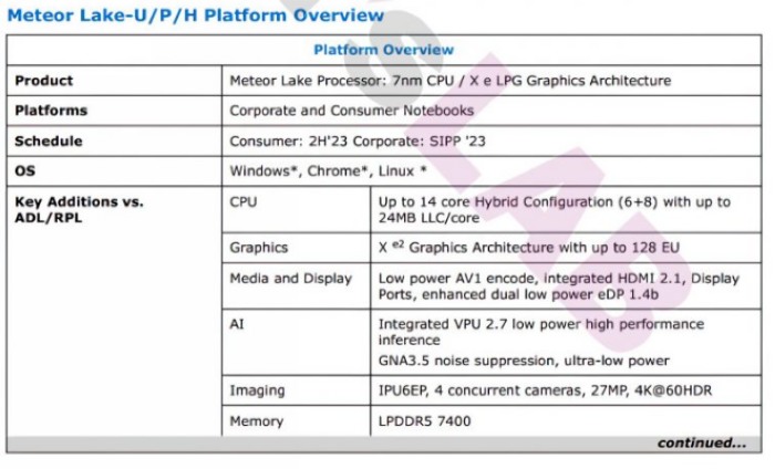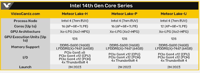 如图,第14代酷睿(Meteor Lake)移动版有三个系列,还是H、P 和 U。