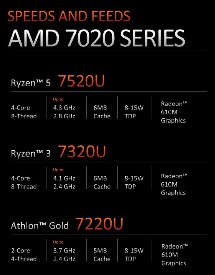说回产品,这个系列有三个型号,分别是Ryzen 5 7520U、Ryzen 3 7320U和Athlon Gold 7220U“速龙金牌”。