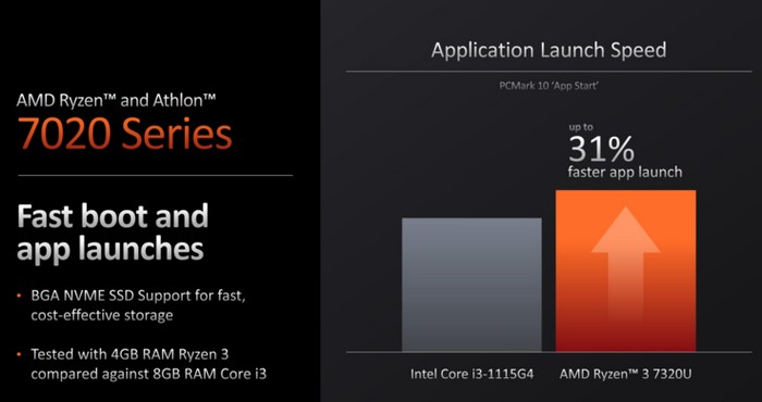 定位最高的 Ryzen 5 7520U 是4核/8线程,最高可加速至 4.3 GHz,默频2.8 GHz。稍慢一点的是Ryzen 3 7320U,加速频率降了 200 MHz,默频降低了 400 MHz。最后,Athlon Gold 7220U是双核的,默频2.4GHz,可加速至 3.7 GHz。