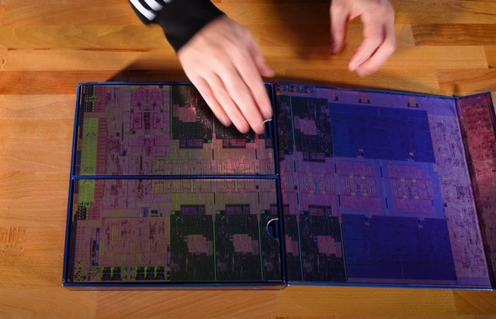 展开后看到是一个硕大的第13代酷睿晶圆印刷图案,里面还真有个没有顶盖的第13代酷睿处理器(坏的 i9-13900K)。据说核心裸片面积约为260平方毫米,波凌波零的~