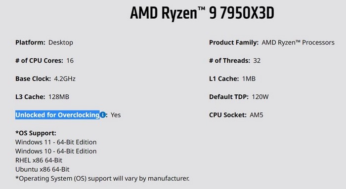 另外,三款功耗都是120W TDP(不是实际最高功耗),都要比非3D缓存的对应版本低(7950X为170W)。另外,官方标注其最高温度为89°C,而7950X 则是95°C。所以猜测三款带3D缓存的新版本预计功耗和温度会对频率影响更敏感。但总好过不能超,用更好的主板和散热器,能更轻松的去榨取性能。
