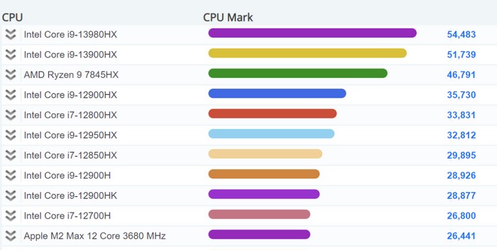 在 PassMark CPU 综合性能榜单上发现, 第一已经变成了i9-13980HX,紧随其后的第二是 i9-13900HX,而之前的第一锐龙 9 7845HX 已经变成了第三。
