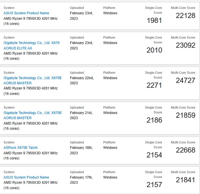 在 Geekbench 5 跑分库中,已经有6个 AMD 锐龙9 7950X3D 跑分成绩,最好成绩是单核2271、多核24727,比没有带 3D 缓存的版本高一些,分别提升4%和7%。由于是测试版,而且不能超频,所以平均的成绩反而并不好,还低于标准版7950X,这个可以忽略。