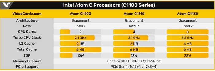 Atom“凌动”C1000系列有C1100、C1110 和 C1130 三款,采用Gracemont高效架构和intel 7工艺制程,最高8核心,32W TDP,这功耗也不低啊~。值得一提的是,支持双通道 LPDDR5-5200MHz内存,还支持PCIe 4.0,最多是20通道,具体的规格如下: