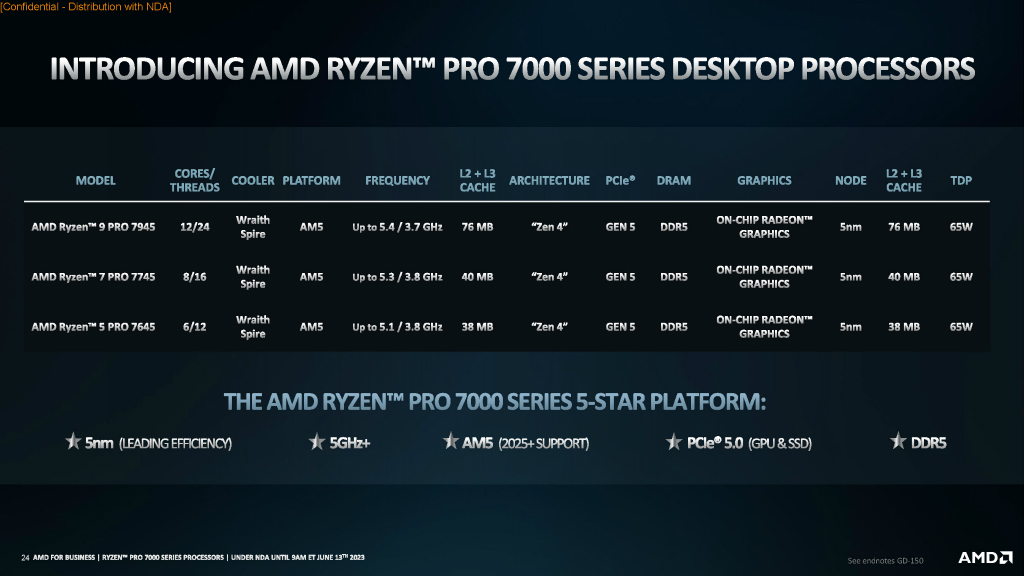 不过,首发只有三款,分别是锐龙9 Pro 7945、锐龙7 Pro 7745和锐龙5 Pro 7645,都是Zen 4全新架构,5nm工艺,都是65W TDP,不能超频,最高12核心/24线程,都支持DDR5内存和PCIE 5.0,集成 RDNA3架构的 Radeon 核显。