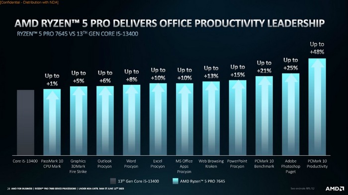 至于性能,官方拿锐龙5 Pro 7645来对比锐龙5 Pro 5650G,最高超45%,具体如下: