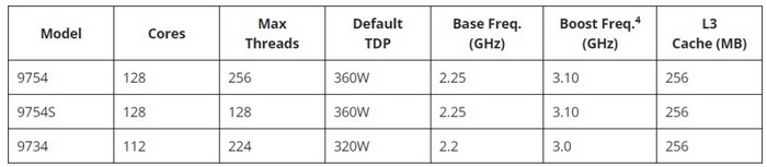 规格惊人,EPYC 9754和9754S两款拥有高达128核心,前者256个线程,后者是128个,都是360W TDP,默频2.25GHz,最高可加速至3.1GHz。定位稍低的9734是112个核心,224个线程,降至320W TDP,默频和加速频率也降至2.2GHz和3.0GHz,三款都是256MB L3缓存。