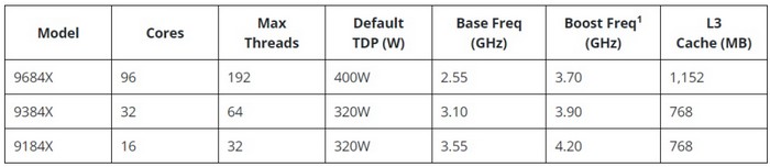 同样有三款,分别是EPYC 9684X、EPYC 9384X和EPYC 9184X,三款跨度很大,最顶级的9684X拥有96个核心,192个线程,400W TDP,默频2.55GHz/可加速至3.7GHz,最关键是拥有1152 L3缓存,这创下了AMD有史以来最大3缓纪录。