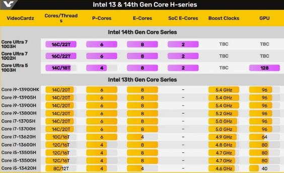 哦对了,酷睿 Ultra 系列对应的是现已第13代酷睿H系列,目前已有三款曝光(实际首发会更多),有酷睿 Ultra 7 1003H、酷睿 Ultra 7 1002H和酷睿 Ultra 5 1003H,核心配置如下: