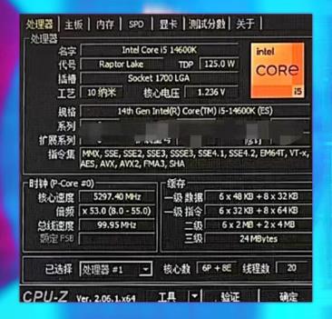 重点看核心和线程以及频率。酷睿 i5-14600K 是6P+8E组合,一共14个核心,20个线程,核心频率5.297GHz,也就是5.3GHz(X53倍频,最高X55),就冲着一点,这颗ES应该是QS版本,即使不是也应该很接近了。