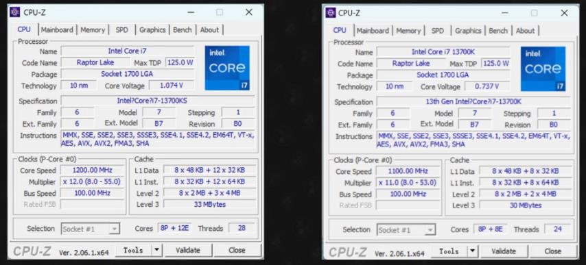 先来看下规格,CPU-Z截图显示,酷睿 i7-14700K 比 i7-13700K 多了4和小核,为8P+12E组合,还是28线程,而且最高睿频来到了5.5GHz,倍频从53来到55X。另外,缓存也不同,尤其是三缓,从30MB升至33MB,L1和L2也有所不同。