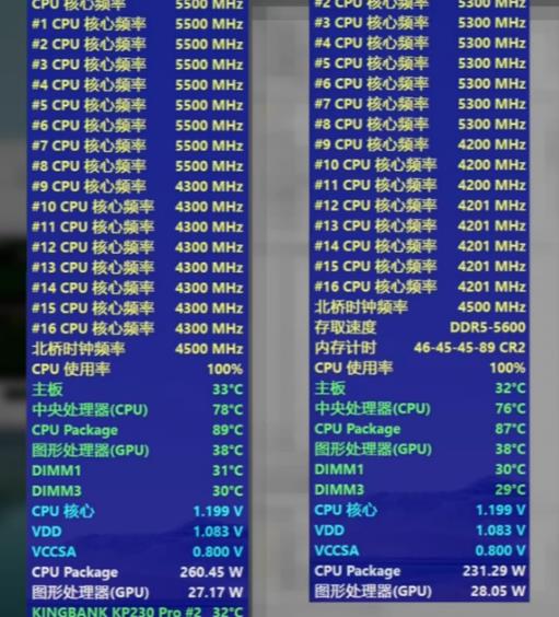 另外,功耗对比看到分别是231.29W和260.45W,仅供参考,多个四个小核,睿频并高了0.2GHz,功耗增加很正常。