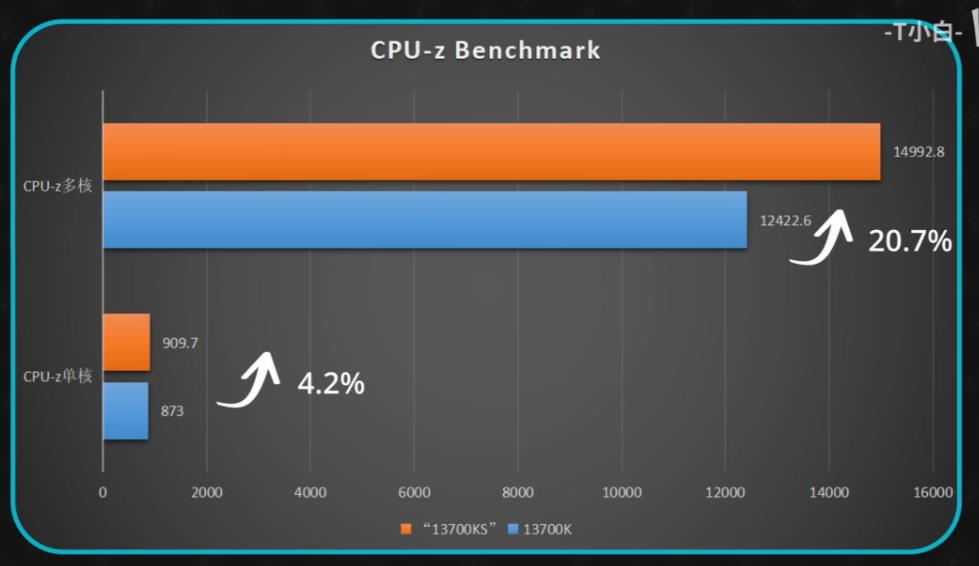 至于性能,CPU-Z 测试单核提升约4.2%左右,多核比较明显最高提升了20.7%;在CB测试中单核4.5%,多核14.3%,多了4个小核,多核性能提升还是比较明显的。