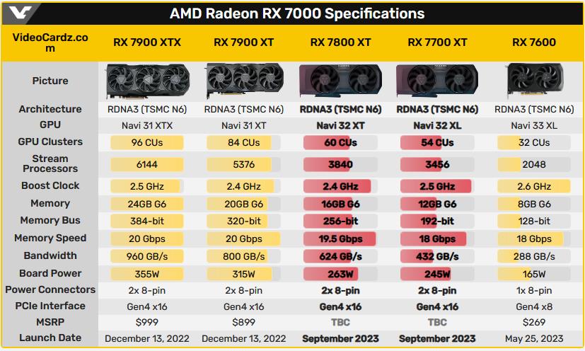 定位稍低的 RX 7700 XT 基于Navi 32 XL 核心,包括54个CU单元,合计3456个核心流处理器,核心最高可加速至2.5GHz,配备12GB GDDR6 显存,192bit 显存,18Gbps 等效频率,432GB/s 总带宽。总体来看,核心数量超预期,显存配置砍的比较明显。