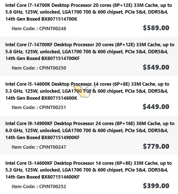 酷睿i9-13900KF →酷睿i9-14900KF:739美元→779美元(+5%)