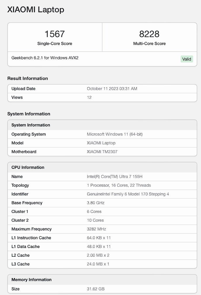 如图,该机内部测试型号为TM2307,确认是小米还未发布的新款笔记本,不确定系列,但搭载了英特尔酷睿 Ultra 7 155H 处理器,这是我们首次看到国产品牌测试酷睿 Ultra 处理器。