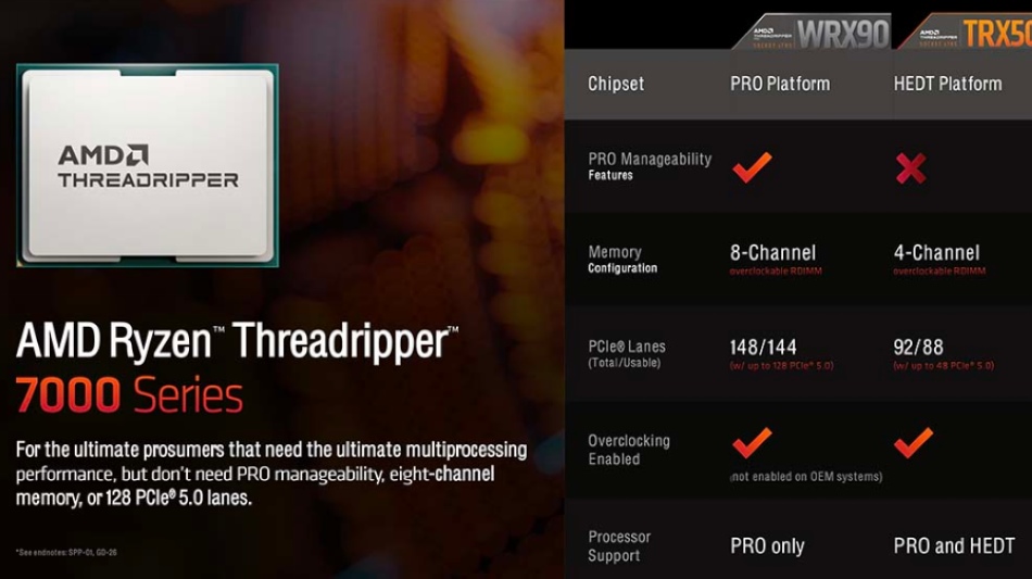 平台上,AMD Ryzen Threadripper 7000 系列需要搭配 sTRX5(LGA6096)针脚的 TRX50 主板,而 Ryzen Threadripper Pro 7000 WX 系列处理器除了 TRX50 主板外,也能使用 WRX90 主板,但 2 者还是有些许差异存在,特别是内存通道数与 PCIe 通道数。