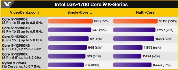 另外,还有性能,CPU-Z测试的单核和多核成绩分别是978和18117.5,这里正常显示出了32线程。这个分数比上代i9-13900KS 还要高,外媒VC统计如下: