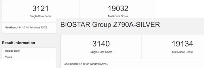 当然,最重要的是性能,单核分数为3140,多核19134;而之前的分数是3121 和 19032。测试用的映泰的 Biostar Z790 SILVER 主板,内存拉胯用的是DDR5-4800MHz。