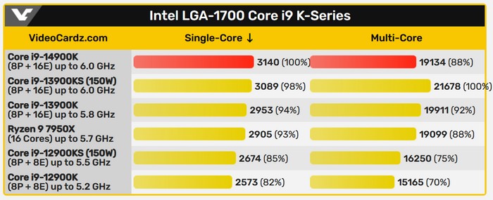 这个分数其实算不上什么惊喜,虽然比之前的高。作为对比,现有i9-13900K 的单核为2953,多核为19911 ,也就是说单核性能提升了大约6%,但多核不如老款(约-4%)。当然,这还是因为ES版,再有内存品牌不高,正常情况下多核性能肯定会比 i9-13900K 高一丢丢,预计正常情况下载21800分左右。