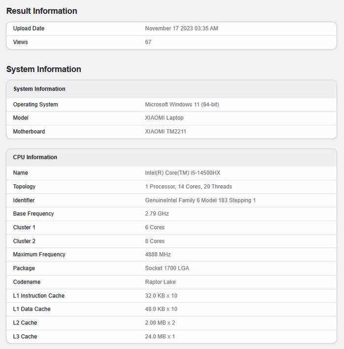 小米方面,一款内部型号为 TM2211 的笔记本出现在 GB 跑分库中,可能是 Redmi G 系列游戏本,搭载第14代酷睿 i9-14900HX 和酷睿 i5-14500HX ,核心配置和性能公开。