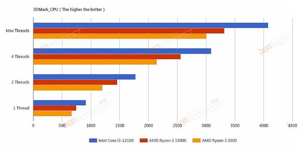 我们看到,这颗 i3-12100 在 PCMark 上领先于 AMD 两款,高出Ryzen 3 3300X大约 15%。在 Cinebench R23 中测试一样,在多线程测试中的性能领先大约为 26%,在单线程测试中为 27%。