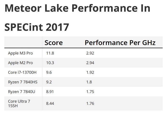 左侧一栏是总得分,右侧是每GHz带来的性能打分,酷睿 UlTRA 5 155H 的分数为1.76,不如上一代酷睿i7-13700H的1.92分高,这说明是退步了。这个分数大概和基于“Zen 4”的7840U差不多;而最好 IPC 的是苹果M系列处理器,遥遥领先于英特尔和AMD的处理器。