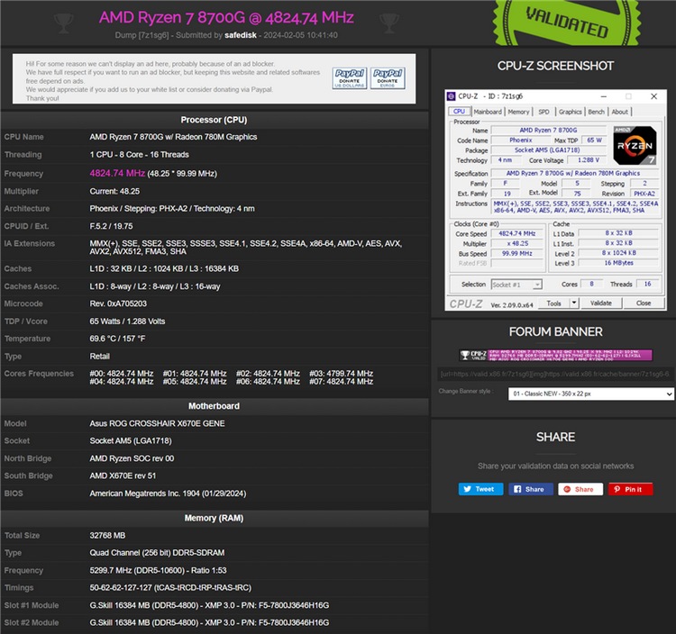 现在,新纪录又诞生了,超频玩家 SafeDisk 成功将DDR5 超到了10060MHz,用的是华硕的 ROG X670E 主板,关键是处理器用的是新发布的 Ryzen 7 8700G APU。