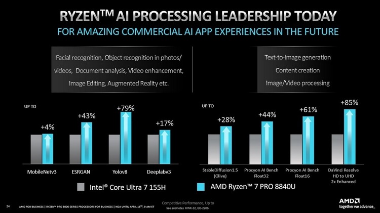 官方列举了 Ryzen 9 PRO 8945HS 和酷睿Ultra 9 185H 的性能对比,在应用性能方面比它高出23%,AI 性能快50%。 此外,低压系列 Ryzen 7 PRO 8840U 在性能上也超过了英特尔的 H 系列,与同级别的酷睿 Ultra 7 155H 相比,使用AI的人脸识别和视频识别等性能高79%,图像转录和视频处理性能高85%。