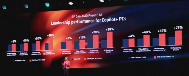 至于性能,AMD 表示最顶级的12核/24线程的 Rzyen AI 300 处理器,包括16个核心单元GPU,可以击败苹果 M3 和英特尔酷睿 Ultra 185H。注意这里所指的是AI性能,不是CPU和GPU性能,最多可以超M3一倍,最低4%左右。