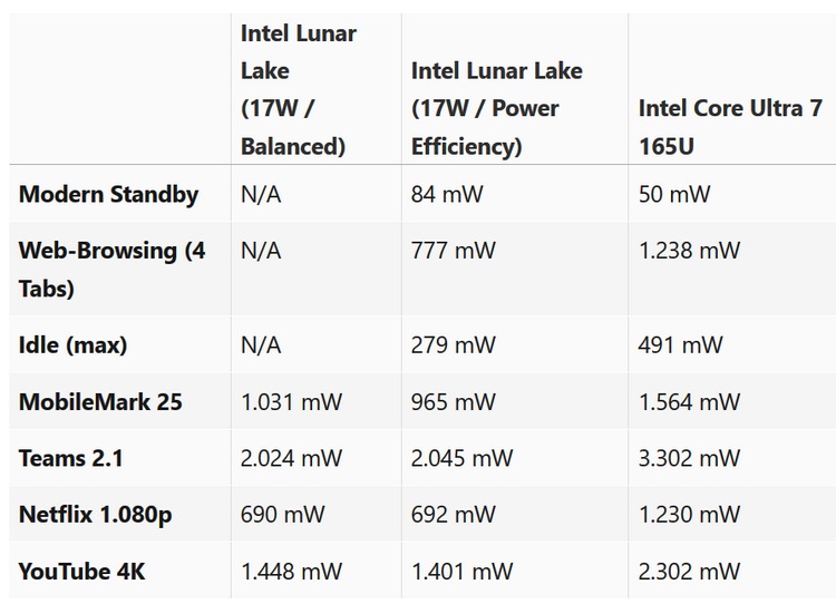 以下是在不同测试环境下的功耗情况,对比了自家的英特尔酷睿Ultra 7 165U: