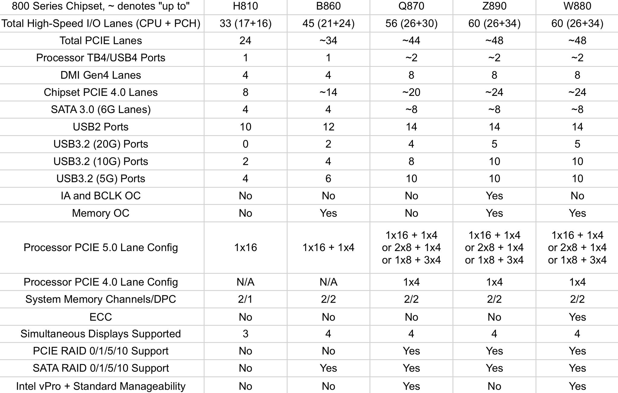 Q870平台的PCIe 4.0通道缩水、扩展也缩水,包括一个20 Gbps或两个10 Gbps USB 3.2等,但在其他方面与Z890相似,最大不同是不支持超频掉了所有超频功能,但具有Intel vPro博锐和远程管理功能。