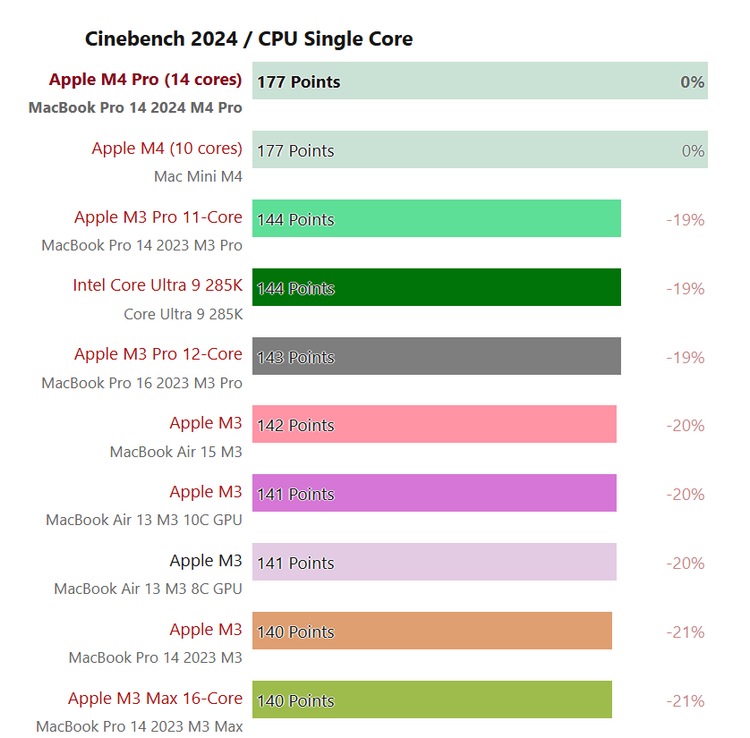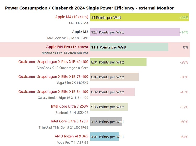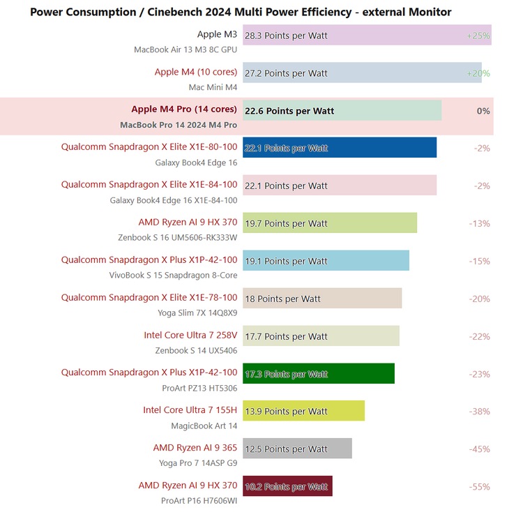 据权威德媒 notebookcheck 消息,通过测试 M4 Pro 发现,无论是CPU单核/多核,还是 GPU 性能,表现都非常抢眼,无可挑剔,编辑说“这该死的性能(夸赞)”。但测试效率时,有点小意外,虽然比竞品仍有优势,但对比自家之前产品,M4 Pro 可以说是退步了。