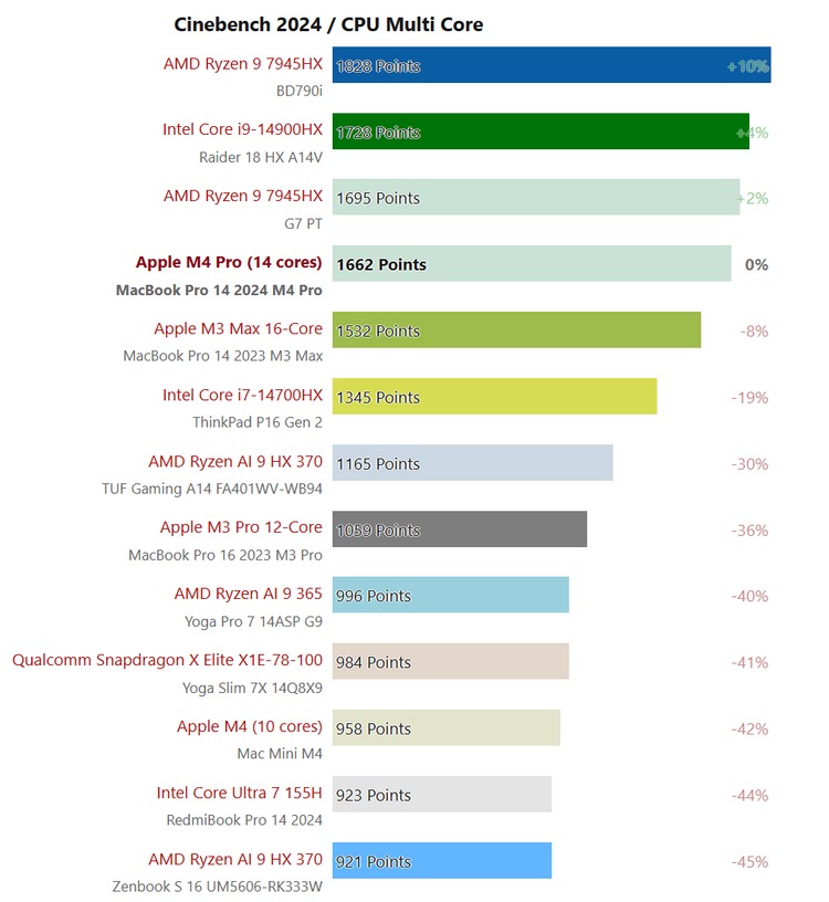 而多核方面,虽然性能很强,甚至超过了M3 Max 大概8%,只比锐龙9 7945HX 低2%,比 i9-14900HX 低4%;但多核能效方面来看,M4 Pro 表现并不好,至少对比自家产品来说。具体来说,M4 Pro 比 M4 低了20%,比 M3 低了25%。这个多核时的能效表现,只比骁龙 X Elite 高 2%,比锐龙AI 9 HX370 高13%。