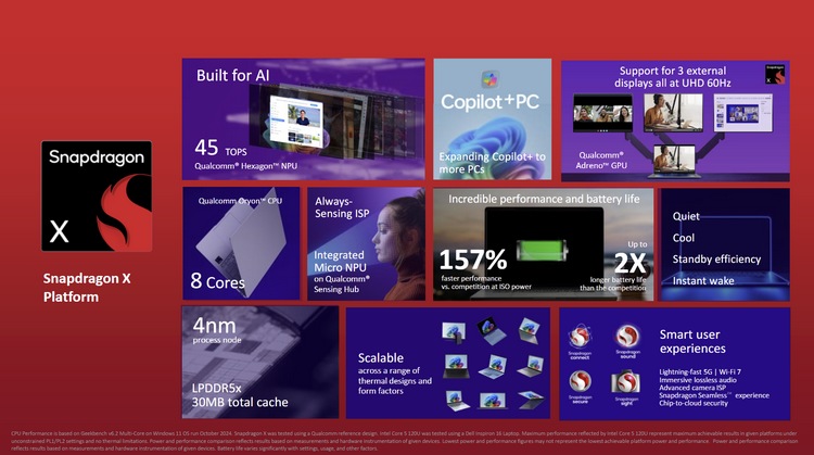 同样,AI 性能也没有降低,因为 Snapdragon X 仍然提供 45 TOPS 算力,和英特尔、AMD Lunar Lake 和 Strix Point 差不多。