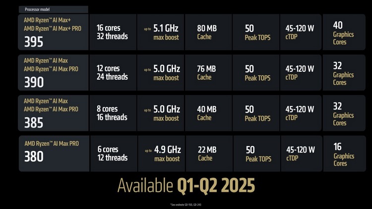 16核/32线程,最高加速5.1GHz,80MB 缓存,50 TOPS 算力,45-120W cTDP 功耗,40单元核显(Radeon 8060S)
