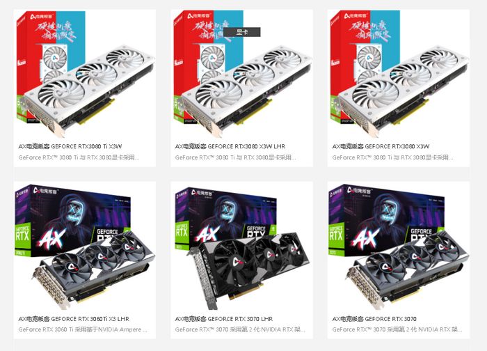 目前AX电竞叛客家族几乎涵盖了所有NVIDIA RTX 30系列显卡,还有LHR限算力版本。不过散热模组只有两套,在各个版本上套用,所以相对单调一些,不过白色的X3W很吸引眼球。