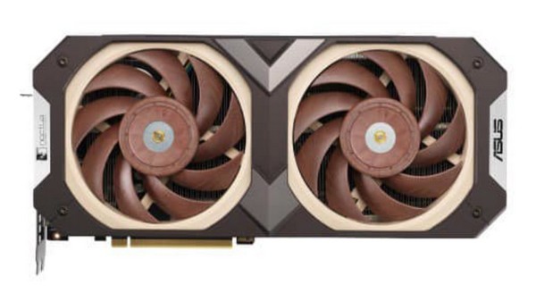 该卡配备了双12cm风扇,型号为 NF-A12x25,远大于常规显卡的 9mm 直径风扇。由于风扇非常厚,所以该卡将占用差不多3.5个槽位,这意味着绝大多数平台只能上这一块卡,而且还得注意机箱的兼容性。