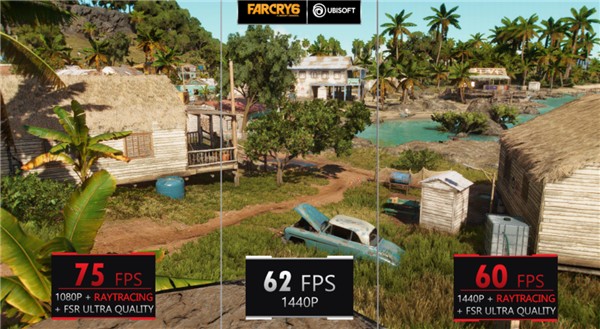 至于性能,在孤岛惊魂6中,2K分辨率下,默认平均帧率为62FPS,同时开启光追、FSR后仍然有60FPS,而如果降到1080p分辨率平均可以跑出75FPS。
