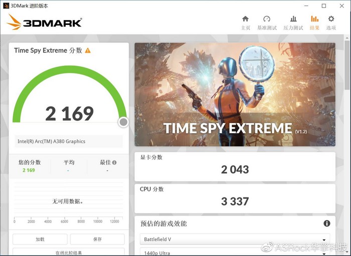 再来测试3DMARK,华擎A380 挑战者 ITX的Time Spy Extreme显卡得分2042分