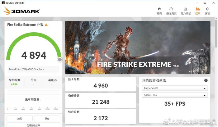 华擎A380 挑战者 ITX的Fire Strike Extreme显卡得分4960分