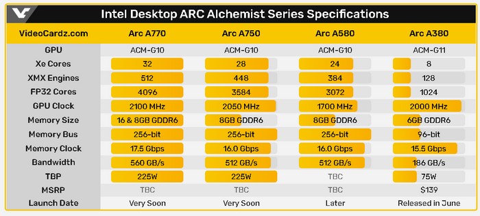 至于规格,据此前消息,Arc A750 配备 ACM-G10 GPU 核心,具有 28 个 Xe 核心,合计 3584 个核心。此外,该卡配备高达 8GB GDDR6 显存,TBP功耗为 225W。
