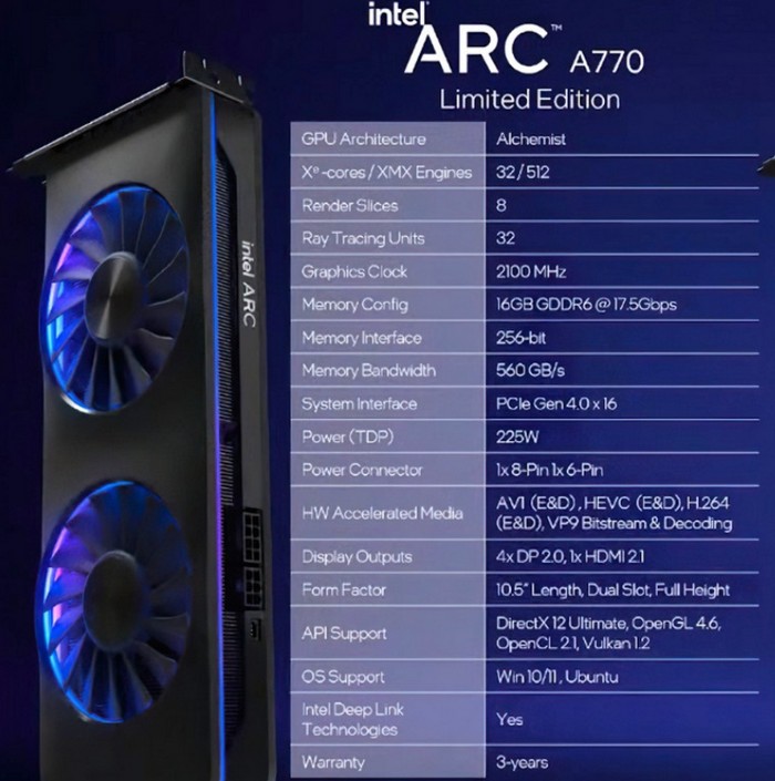 不止第13代酷睿家族,英特尔还正式发布了 Arc A770“锐炫”桌面级游戏显卡,售价 329 美元(约2360元)起,定于 10 月 12 日发售。