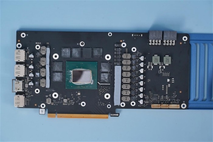 拆解看到,该卡是定制方案,有双 8 针外接供电,PCB上有 8+4 相供电。